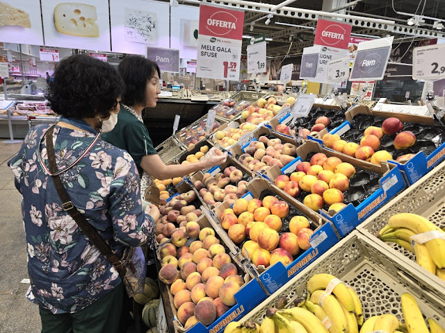While shopping, I decided to buy flat peaches. Shoppers are required to bag their own produce and print a barcode at self-service kiosks. Navigating the Italian-language instructions was a challenge, but a friendly local helped me successfully purchase the peaches.